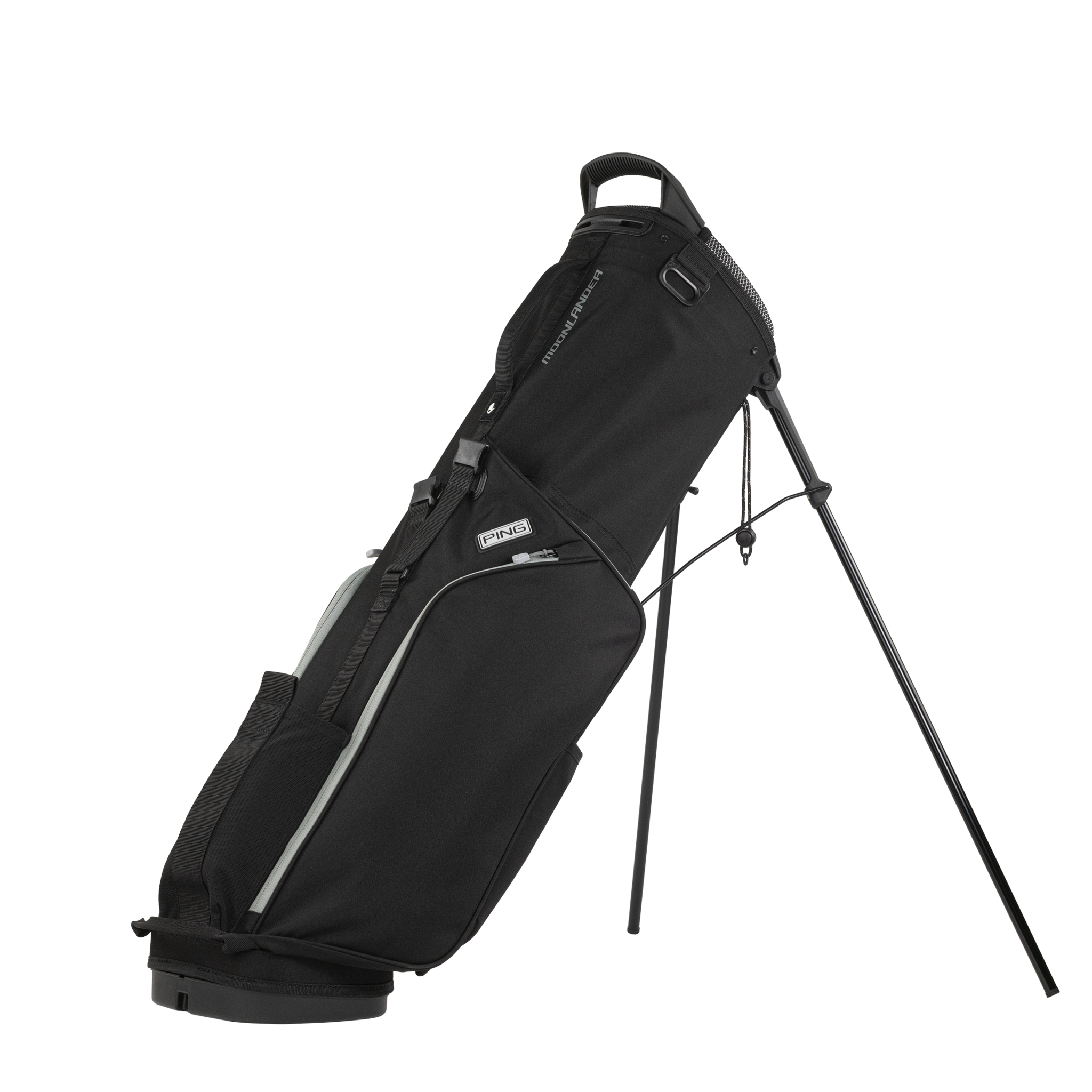 Introducing Moonlander, designated for the walking purist who favours a simpler, cleaner design with only enough pockets for essentials. It is light, only 4 1 lbs., and has six pockets, including for a rangefinder, water bottle, and light apparel. Juniors can transition to this adult-size carry bag by adding Prodi G club risers to fit the length of their clubs. Straps are convertible to a single or double