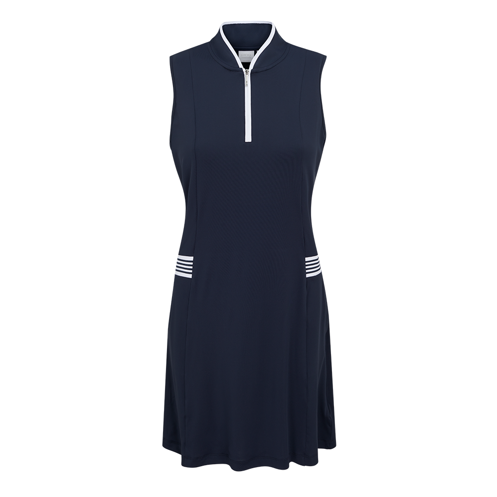 Functional and stylish, the ladies Mazzy Performance Dress in Cornflower Blue. Featuring a mandarin-style collar, zip neck, and two front pockets, this golf dress combines fashion and function effortlessly. The striped elastic waistband offers a tailored fit, while the pleated back detail and 'etched impressions' jacquard add a touch of elegance. Detachable shorts and a dropped back hem provide extra coverage and comfort, making this sleeveless dress a must-have for every round.