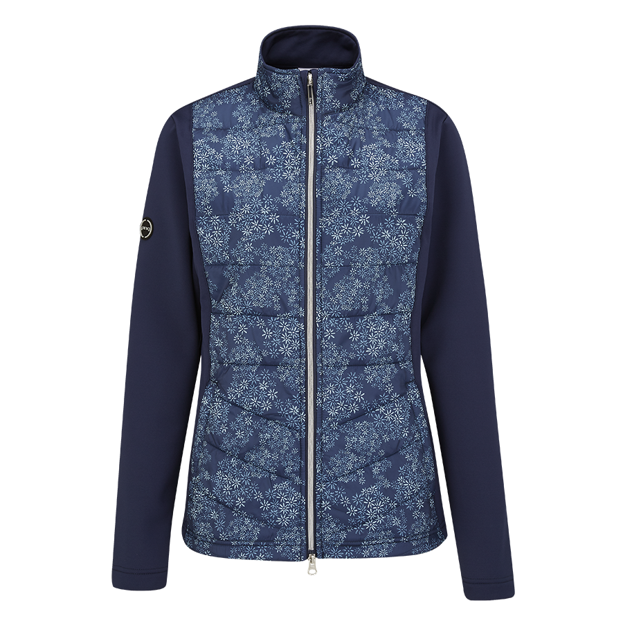 Printed hybrid jacket, engineered for warmth in cold weather.