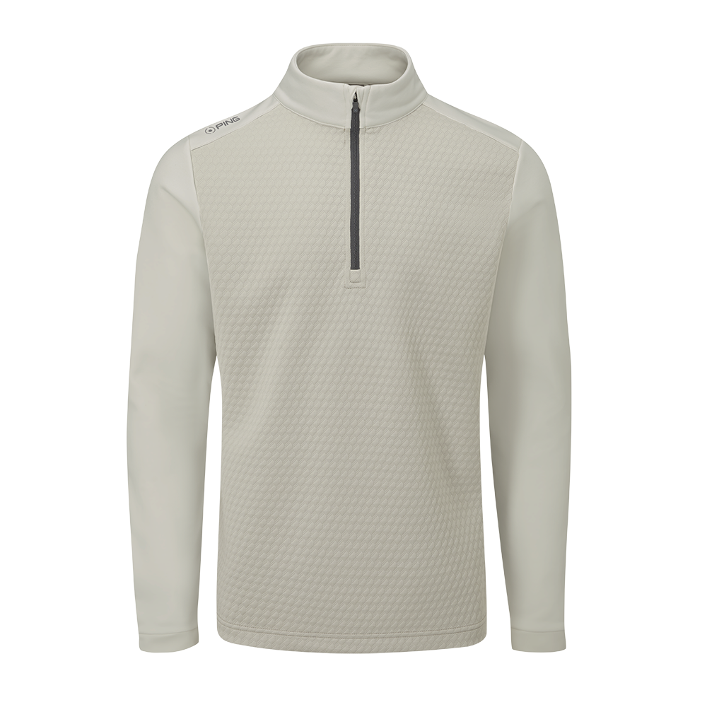 Bring a refined look to your winter layering with the men's Nolan Quarter Zip Fleece in Willow/Egret. Designed with a tonal geometric jacquard pattern to the front and back panels, this fleece delivers subtle visual interest alongside functional performance. A water-resistant finish shields against light showers, while the soft brushed fabric ensures comfort across chilly rounds. Finished with classic PING branding at the right shoulder and back neck, this lightweight layer blends style and substance for the season ahead.